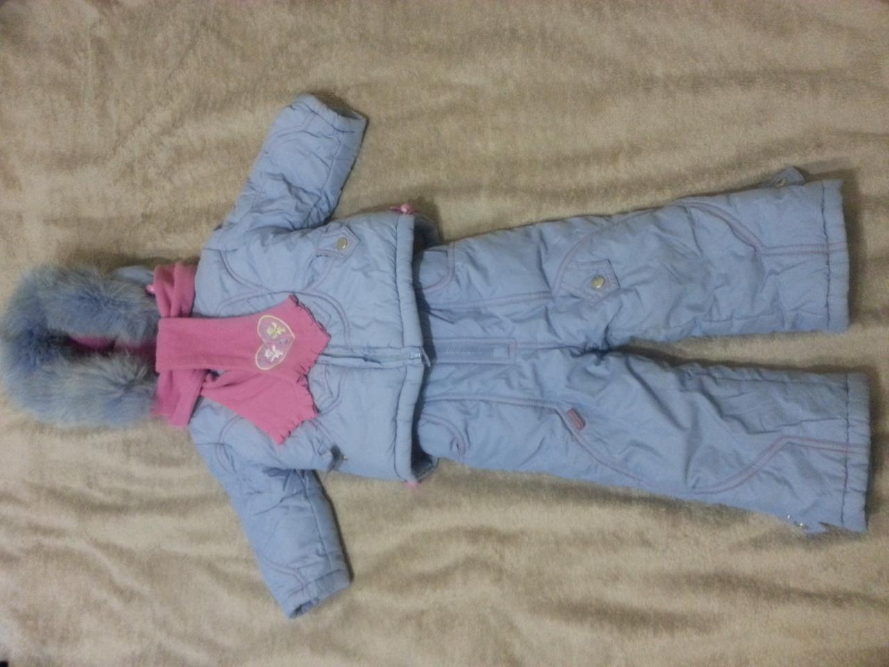 Костюм в хорошем состоянии на рост 80 см (1.5-2 года). У куртки капюшон на кнопках. Длина куртки по спинке 41 см, внутренняя длина рукава 20 см, стирается отлично. Штаны от пояса до низа 52 см, длина по внутреннему шву 29 см+ сиреневый шарф