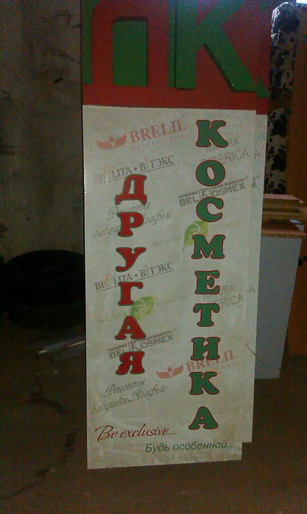 вывеску с подсветкой 1м*3м акрил молочный в коробе глубина 15см.подсветка 6 ламп дневного света.нужно только наклеить печать и повесить.если надо с макетом и печатью помогу.цена вывески без печати - 2500грн.0931397614