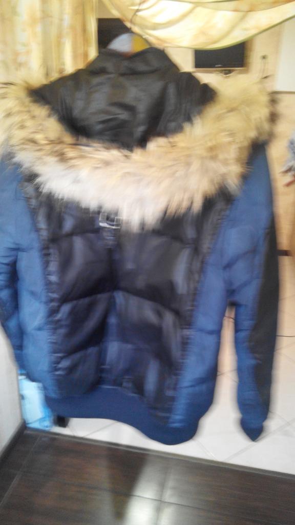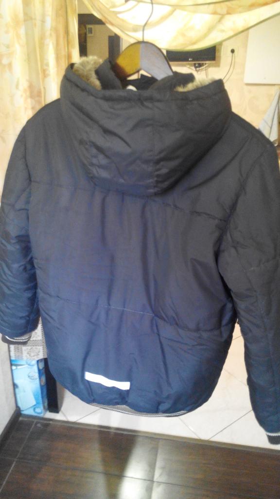 3. Куртка с капюшоном, пух - 80%, перо- 20%, верх - 100% полиэстер, теплая, цвет черный c синими вставками, ДИ 70, ШИ 54, ДР 75, 370 грн. Есть нюанс - на рукаве небольшое пятно.