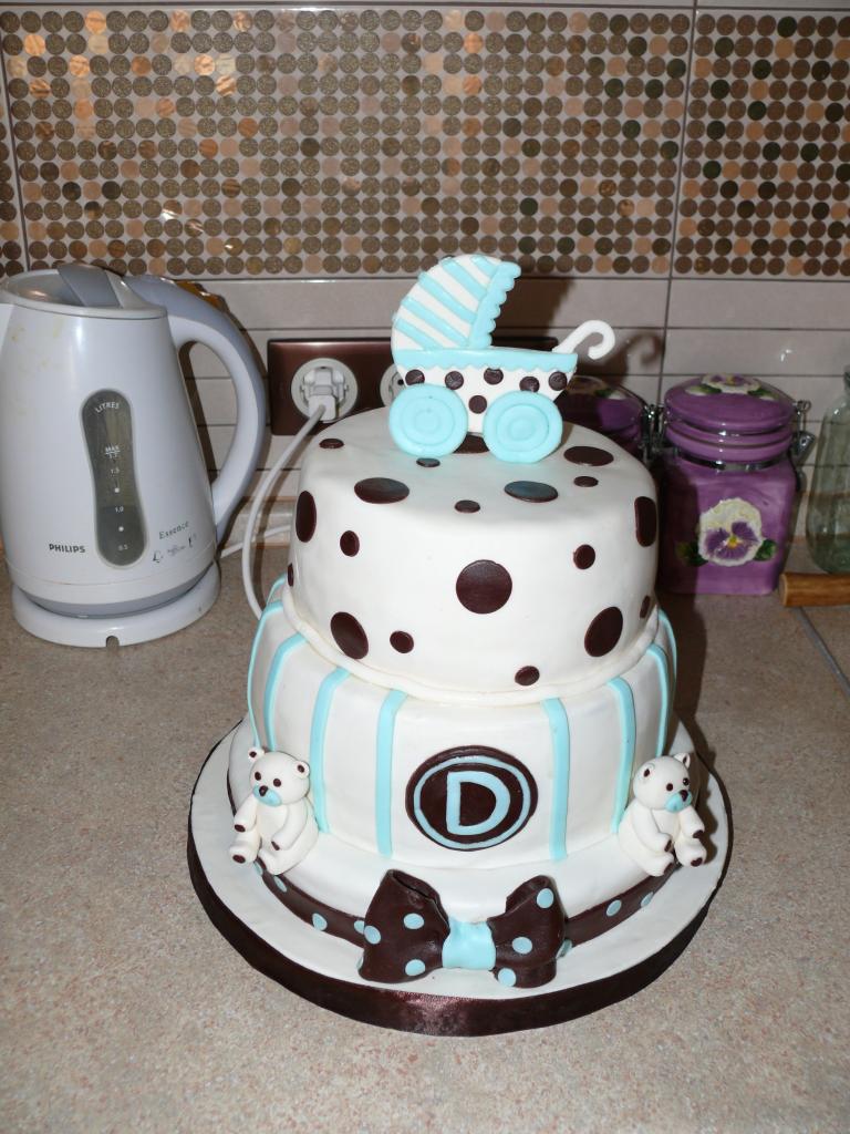 3-х ярусный с коляской. 2 нижних яруса - шоколадные коржи, шоколадный муслин и вишня. 3-й ярус - ванильный бисквит, сливочно-йогуртовый крем, клубника + банан. Вес 7кг.