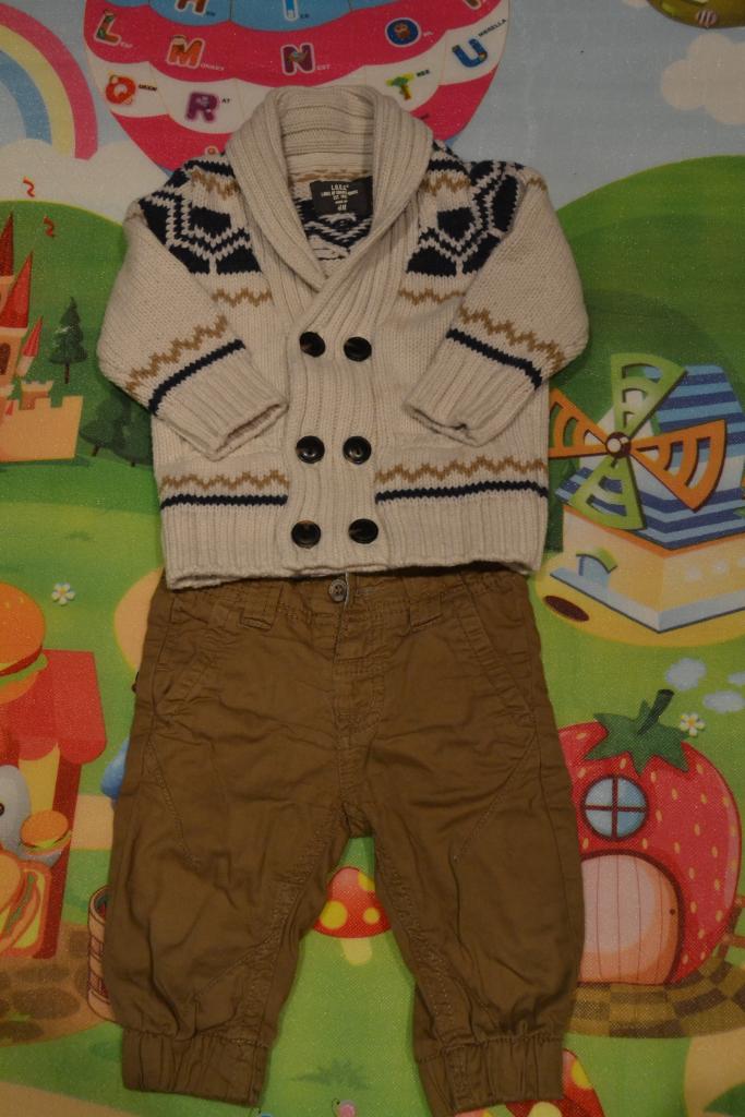 Продам наш комлектик брючки на подкладочке очень удобные и пуловер фирмы H&M на возраст 3-6 мес. Пуловер будет дольше. Состояние брючек отличное. Пуловер состояние хорошее, но есть нюанс - два маленьких едва заметных пятнышка спереди (на фото видно).