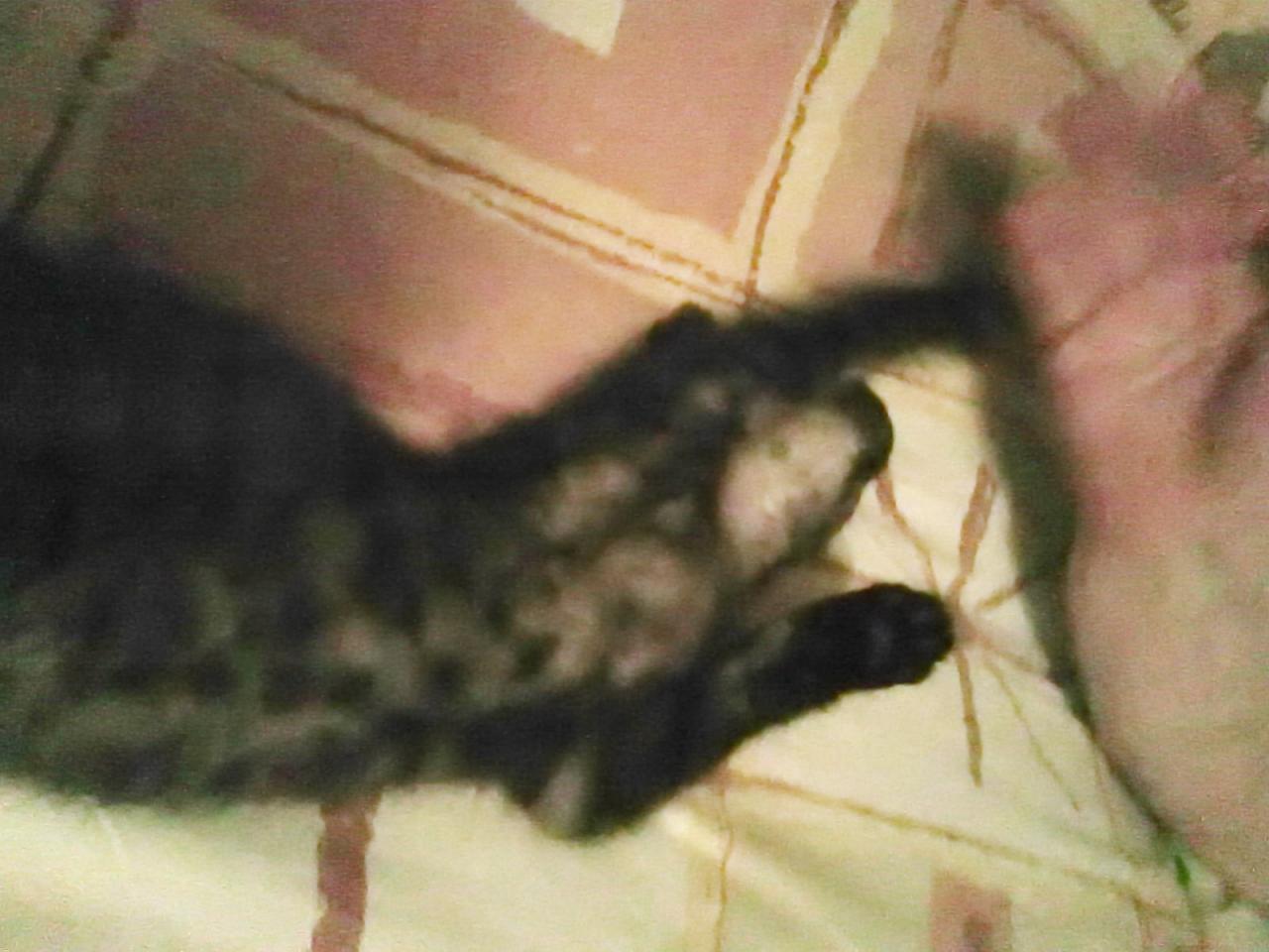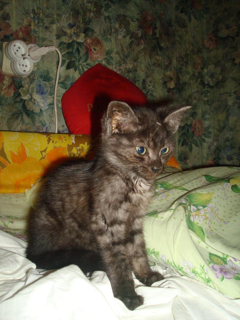 Позже выложу фото. Окрас очень необычный. Черный с дымчато-серыми полосками по бокам.