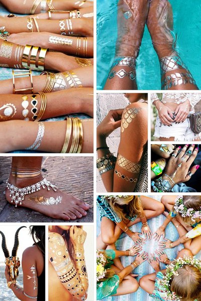 Flash-тату появилась два года назад под маркой Dior. Именно этот Модный дом первым задумался над созданием временных татуировок, безопасных для здоровья человека. Ну, и как положено мировым брендам, все их творения должны быть, безусловно, модными и стильными. Поэтому флэш-татуировки так напоминают нам ювелирные украшения. Самый распространенный вариант татуировки – металлическая цепь или браслет. Металлик может иметь как золотой, так и серебряный оттенок. Имитация ювелирного украшения особенно привлекательно смотрится на загорелом теле.