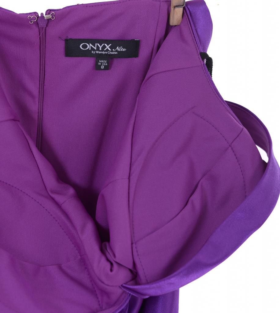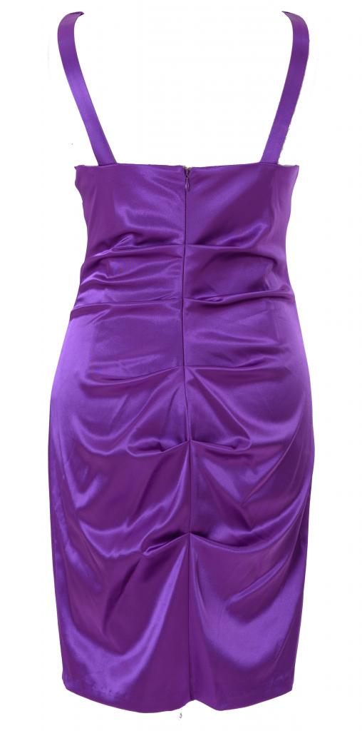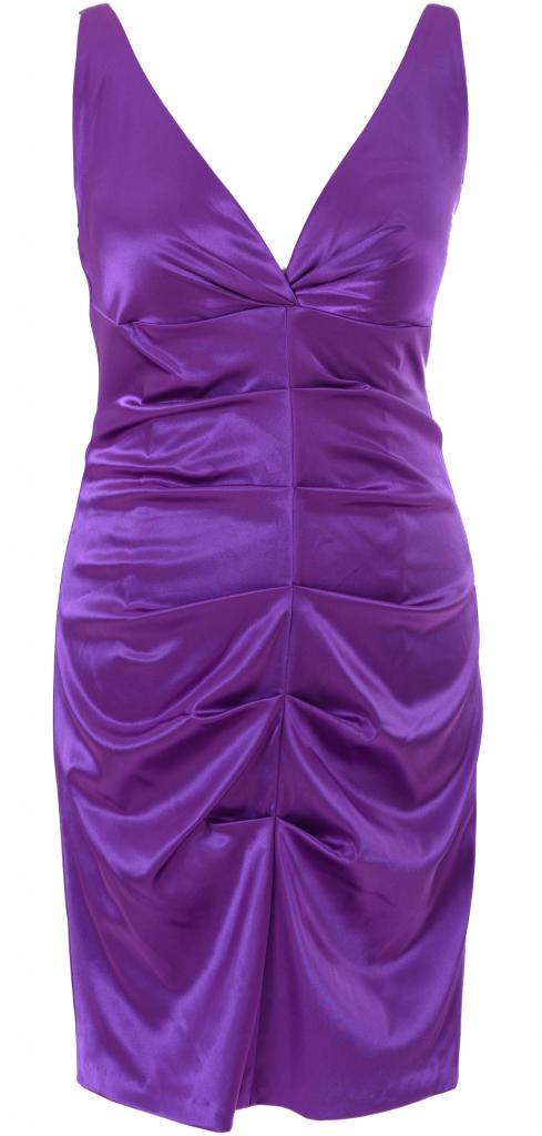 Нарядное платье фиолетового цвета красиво облегает фигуру. V-образное декольте позволит продемонстрировать красивую грудь и плечи.
