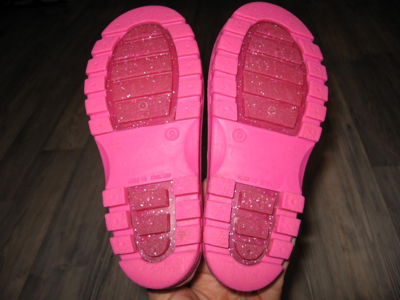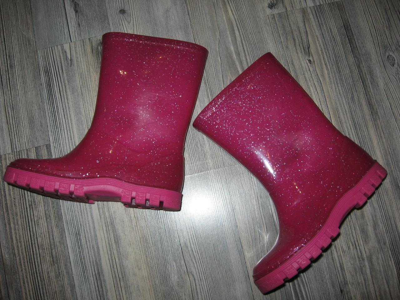 резиновые сапожки малиновые в блестки.состояние новых,фирму не помню (made in england),размер 9,по подошве 18,5см,по стельке примерно 17см (очень тяжело померить) 180грн к ним есть дождевик пальто Gap (смотрите в моих объявлениях)