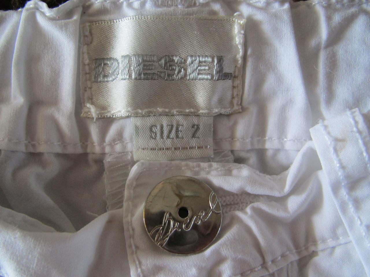 Стильные фирменные шорты DIESEL (Италия) белого цвета, оригинал, застёгиваются на молнию и кнопку, стилизованную под пуговицу, в пояс вшита регулируемая резинка (утяжка). Карманы спереди и сзади украшены стразами. Размер 2 (на возраст от 2 до 4 лет).