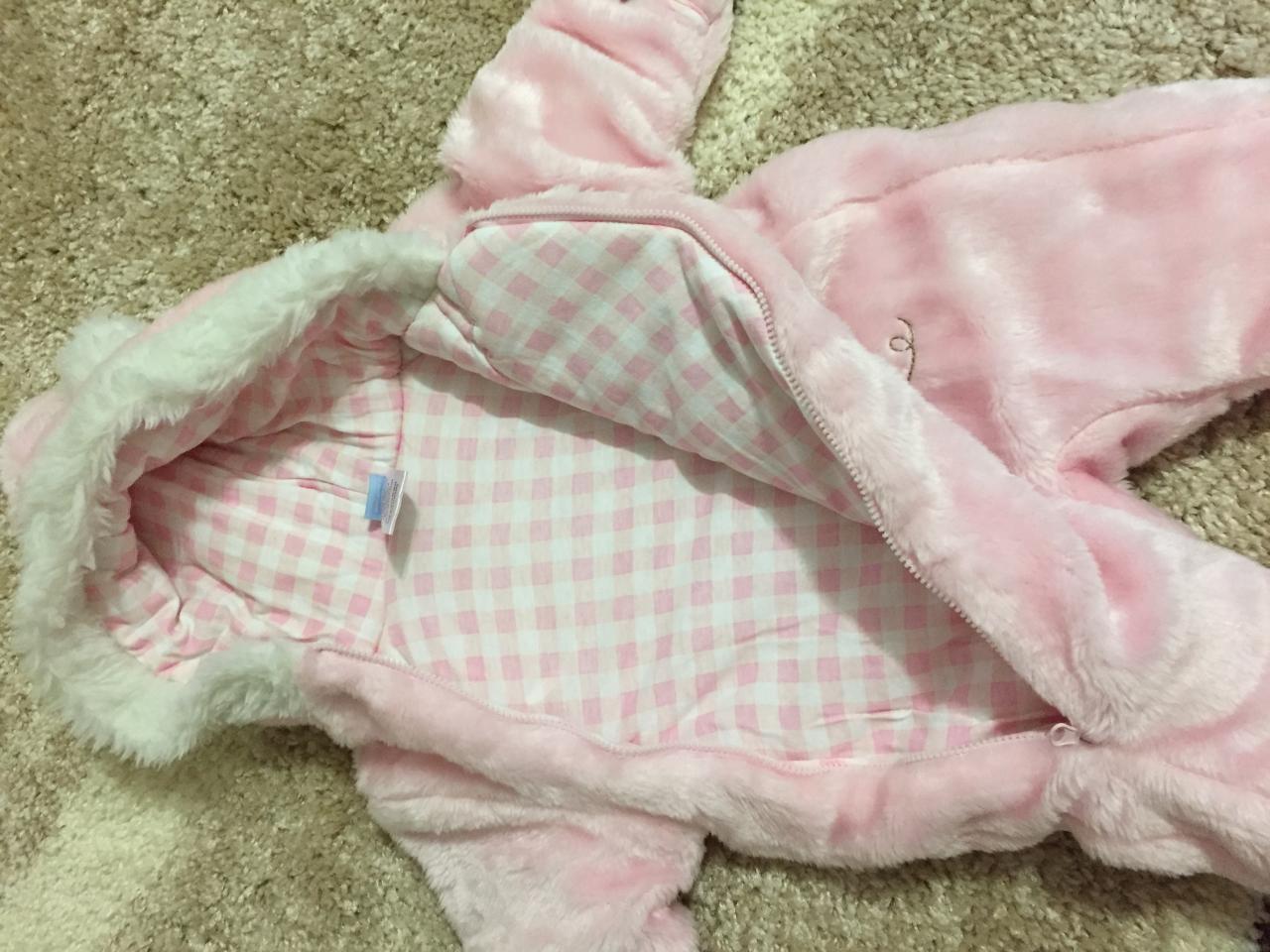 1. Новый плюшевый Диснеевский комбинезон розового цвета. Ручки закрыты, при желании можно открыть, отвернуть. Без бирки, т.к.стиранный, но ни разу не одетый. Покупала на форуме, была беременной и сразу постирала, а на нас был большой. Подойдёт на 3 месяца. Утеплённый