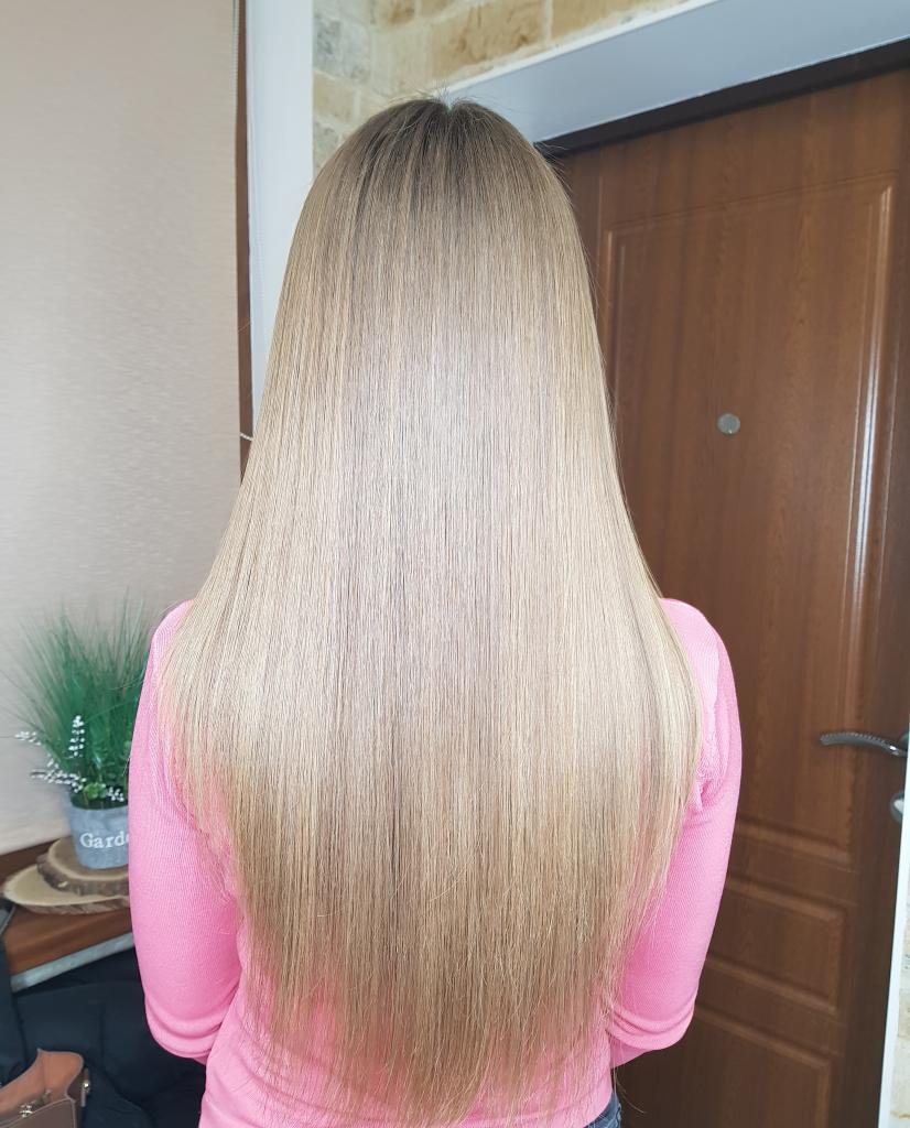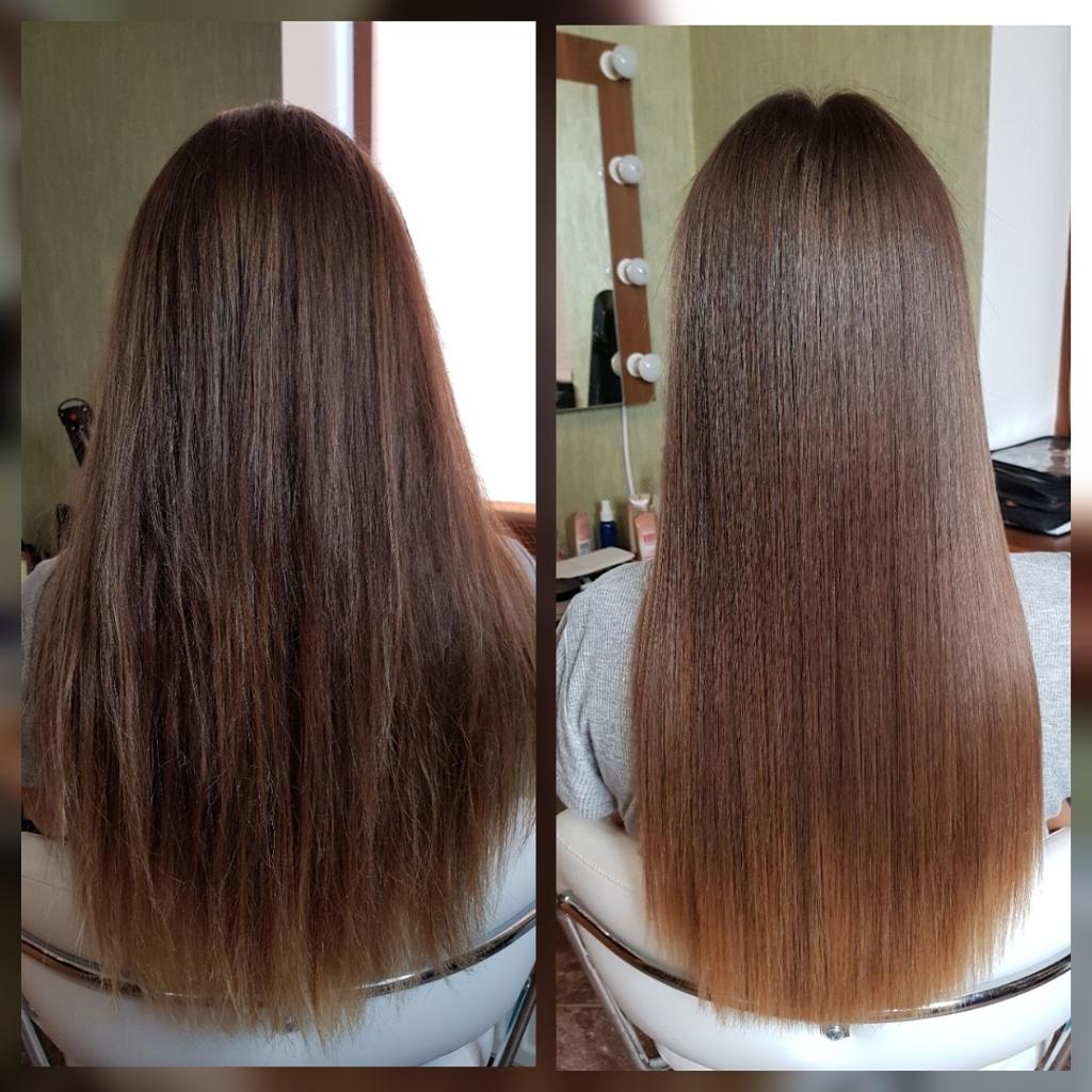 На срок действия кератина (2-4 месяца) Вы можете отказаться от вредных для волос утюжков, расчёсок-выпрямителей, фенов и других термически агрессивных средств. Волосы получают отдых и восстановление. Вы получаете максимальную длину волос, ведь только абсолютно ровные волосы могут быть абсолютно длинными.
