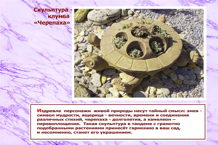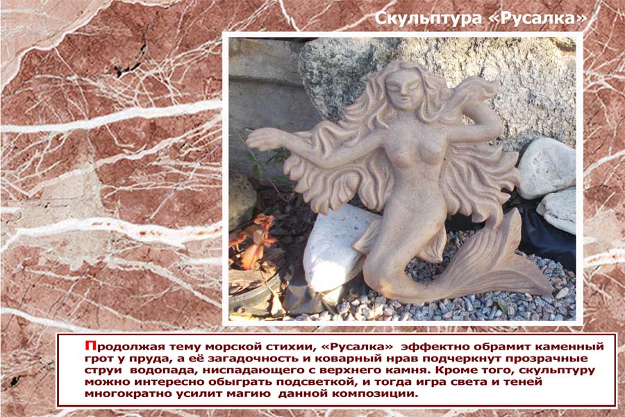 Для своих творений скульпторы выбирают различные материалы. Это может быть и глина, и фарфор, и дерево. Мы остановились на искусственном камне, как наиболее прочном и долговечном материале. Именно это прекрасное сочетание имитации природного камня в садово-парковой скульптуре с архитектурными постройками, водоёмами и рукотворными уголками природы создаёт законченный образ участка, когда красота природы соединяется с совершенными творениями человеческих рук, а для вас облегчит создание полной картинки вашего ландшафта.