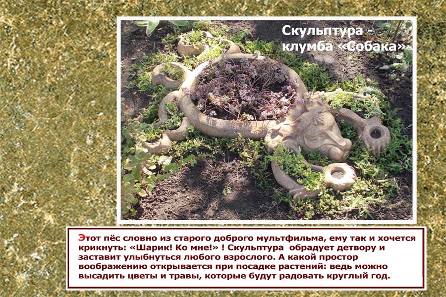 Как человек творческий считаю, что для всех кто живет в своём доме, усадьбе эстетическая составляющая жизни на земле наиглавнейшая. В последнее время авторская скульптура приобрела огромную популярность, привлекая к себе внимание. Многие дизайнеры, весьма охотно используют авторские скульптуры в своих проектах. Используя скульптуру можно с легкостью подчеркнуть тот или иной стиль и придать ландшафту больше уюта и комфорта.