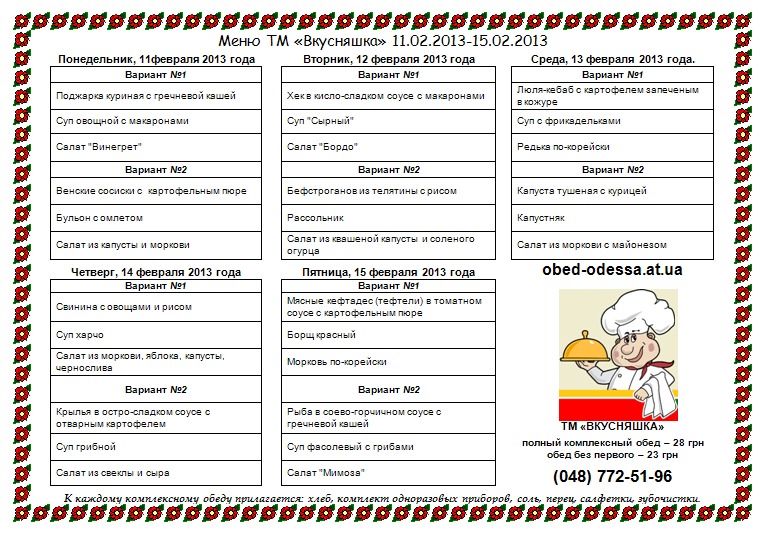 Кто заинтересовался, пишите в личку свой e-mail, я Вам скину менюшку на неделю.