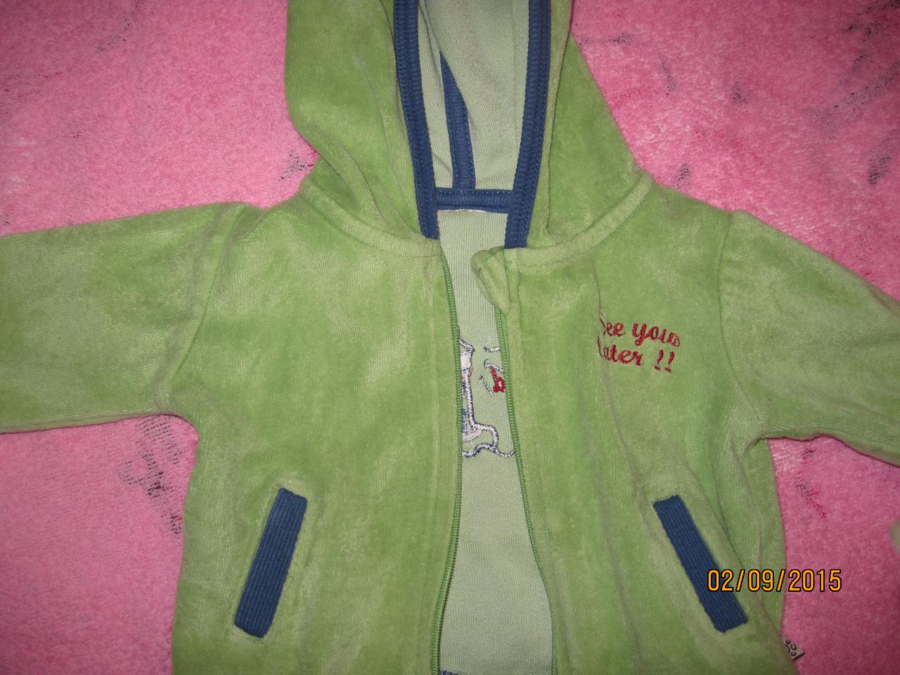 Спортивный костюмчик велюровый состояние хорошее (единственное на собачке змейке облезла краска) одевали не часто. Размер где то от 62-64 мы в 4 месяца еще курточку спокойно одевали, а штанишки были как шортики). Цена 50гр.
