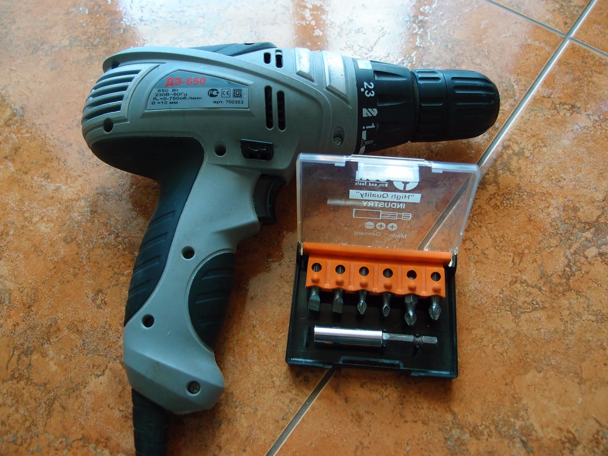 - Шуруповерт электрический, мощный с трещеткой и набором бит.