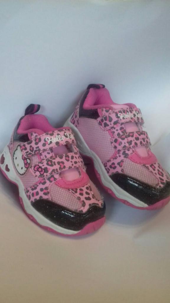 Кроссовки фирменные hello kitty .Размер по стельке 13 см, пятка жесткая.Подошвы при ходьбе горят сердечками