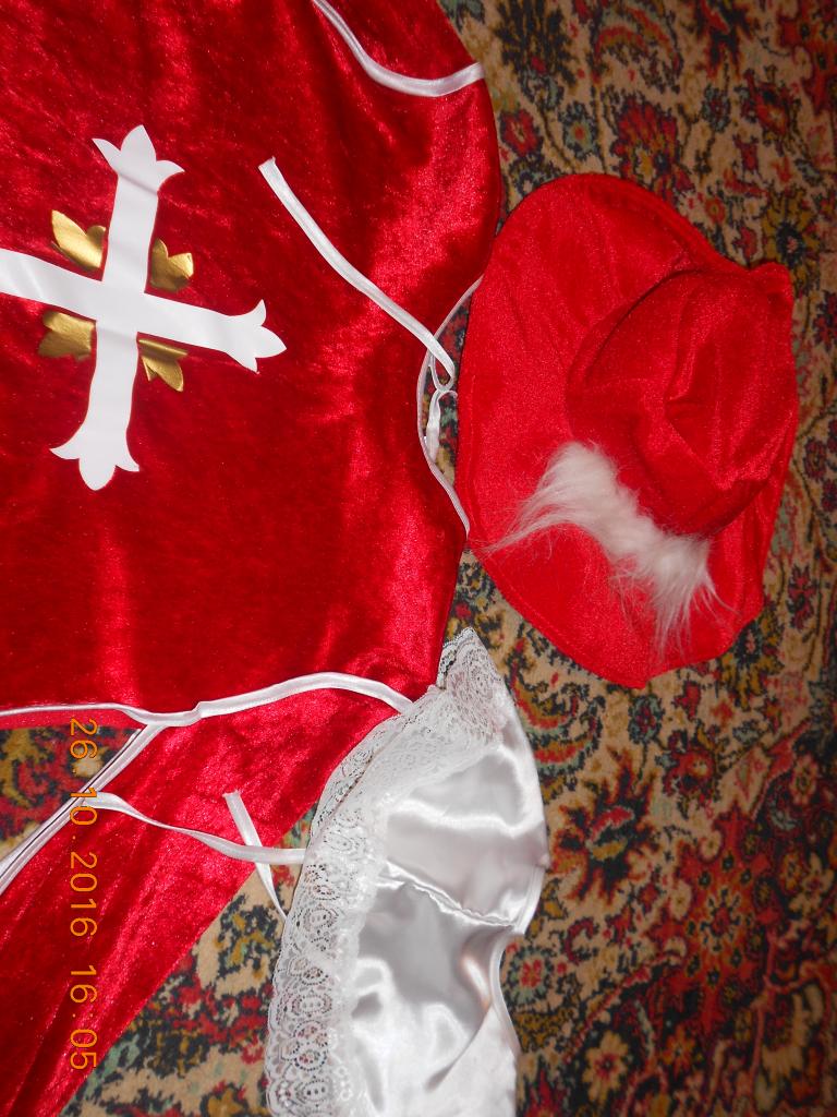 Мушкетер ( думаю подойдет 4,5-7 лет) штанишки по наружнем шву 50 см , плащ длина 57 см. Прокат 100гр. Залог 250гр.