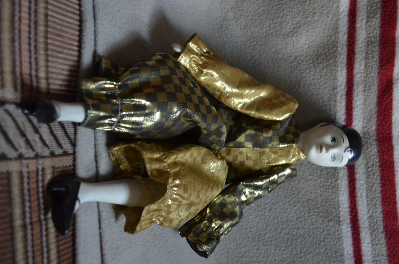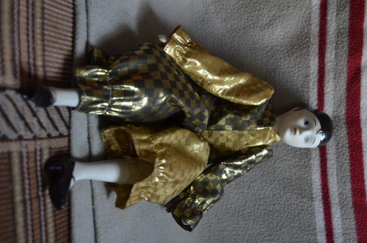 Большой Арлекин рост 40 см. Состояние отличное. Благодаря проволочному каркасу может принимать любую позу. Ручки, ножки, голова фарфоровые. Привезен из Голландии. - 400 грн