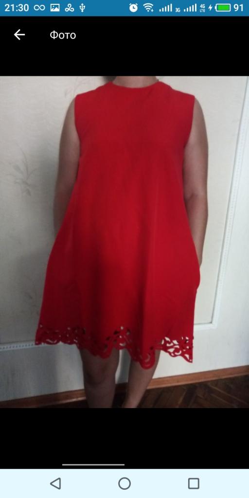 Платье красного цвета из креп дайвинга,внизу перфорация,размер 50.Обьем груди 102 см,длина спереди 90 см,длина сзади 100 см.по бокам платья скрытые карманы.очень красивое.Цена 270 грн