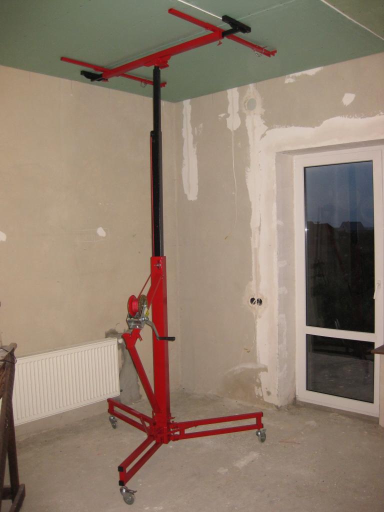 Новый подъемник для качественного подъема и горизонтальной фиксации гипсокартонных листов на высоту 3,4 метра. С помощью подъемника, монтаж потолка, может выполняться одним человеком.