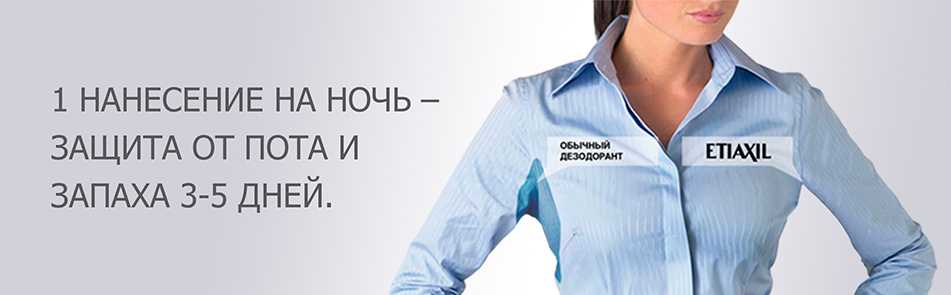 Антиперспиранты Etiaxil – это антиперспиранты ночного действия производства Дании, обеспечивающие эффективную и длительную защиту против обычного (умеренного) и повышенного (гипергидроз) потоотделения и запаха пота в области подмышечных впадин, рук и ног. Etiaxil являются клинически протестированными средствами, не нарушают функции потовых желез, нормализуют их работу, не содержат ароматизаторов (лишены парфюмерного запаха), имеют бесцветную гелевую основу, быстро высыхают, не оставляют следов на белье. Подходят как для женщин, так и для мужчин, могут сочетаться с любыми дезодорантами, духами и туалетной водой. После одного нанесения на ночь запатентованная формула Etiaxil обеспечивает защиту от пота и запаха до 5 дней. Пользоваться Etiaxil достаточно 1 или 2 раза в неделю или реже в зависимости от индивидуальных свойств потовыделения.