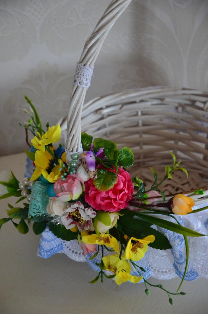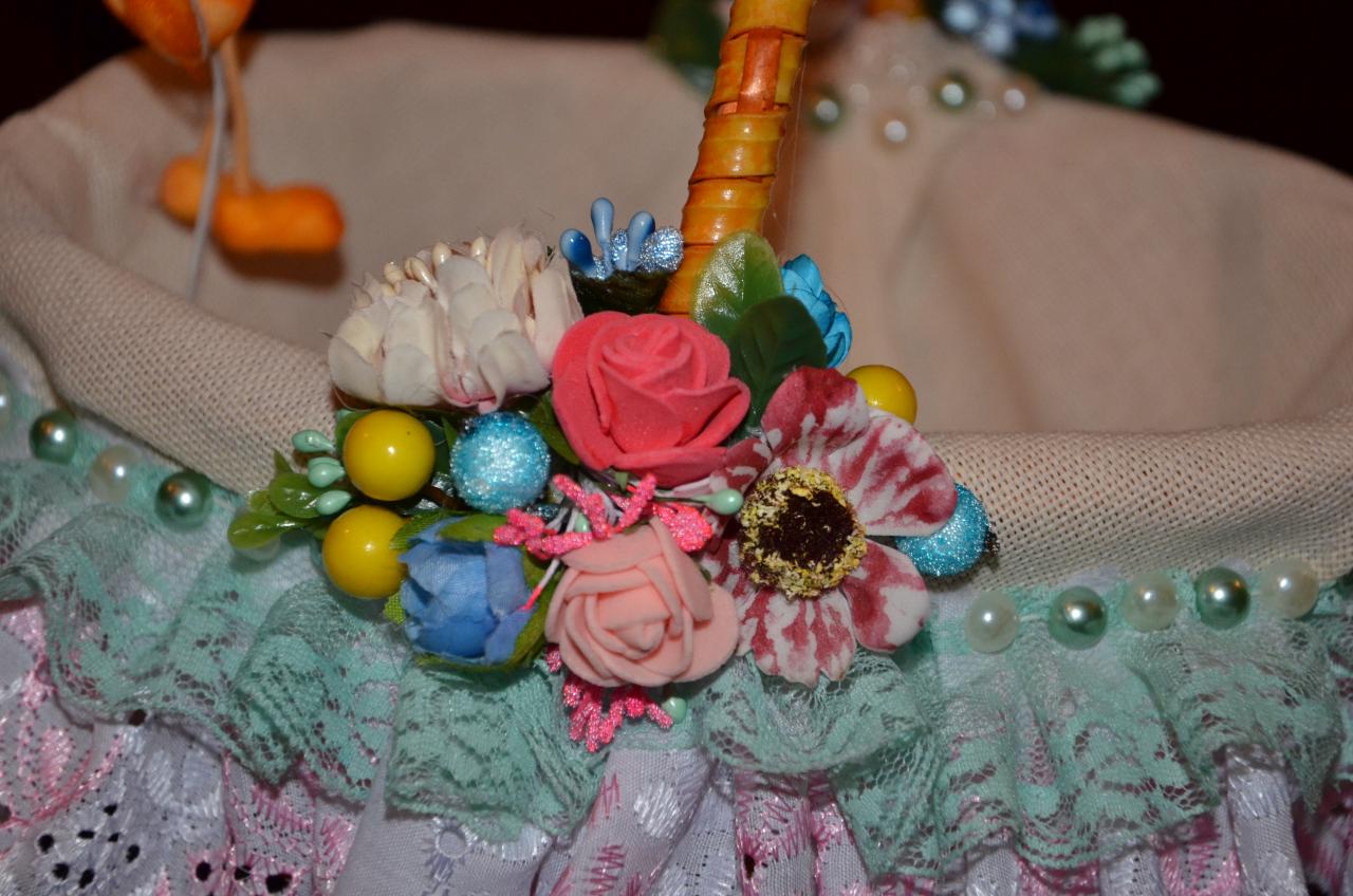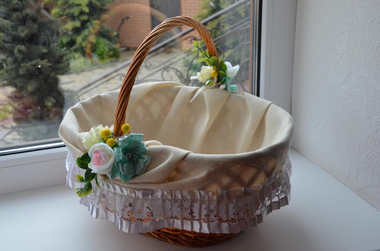 Мои корзинки украшены цветами, расшиты кружевом, очень нарядно и празднично смотрятся.