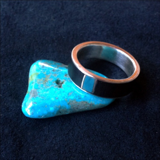 Мужское серебряное кольцо с вставкой из черного дерева (гренадил), инкрустированное серебром и бирюзой.