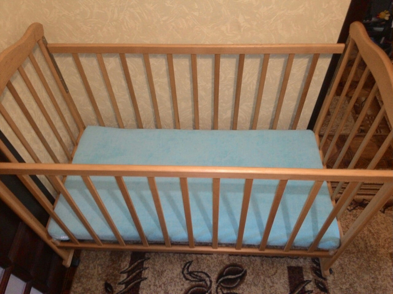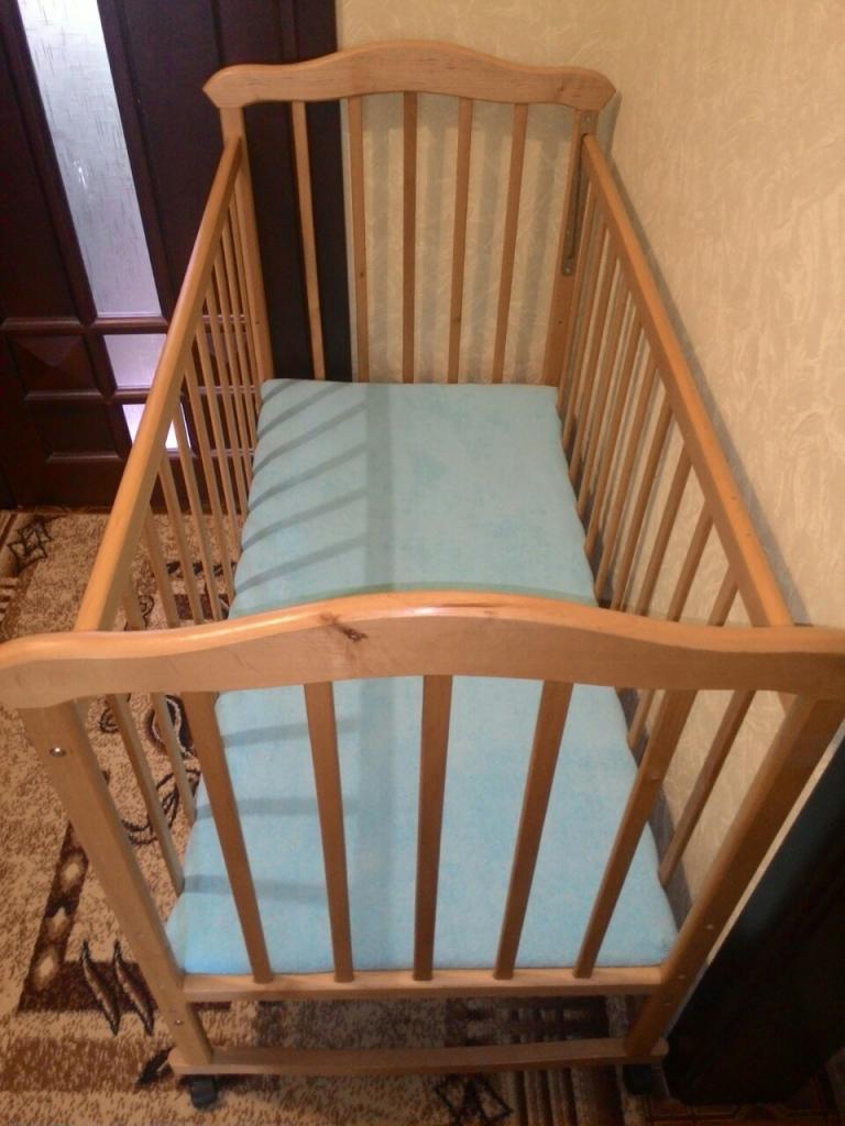 Продам детскую полированную кроватку на колесиках, в отличном состоянии, 3 положения дна, передняя стенка опускается + матрас 4-слойный с кокосовым наполнителем и запасным чехлом на змейке.