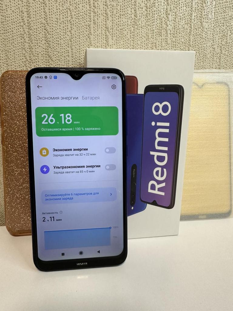 Продам Xiaomi Redmi 8 синего цвета в полной комплектации и с коробочкой (всё, как на фото). Памяти 3/32GB. Батарея держит больше суток (смотрите фото). Полная комплектация + поклеенное новое стекло + 1 стекло запасное + чехол. Состояние прекрасное, как на фото