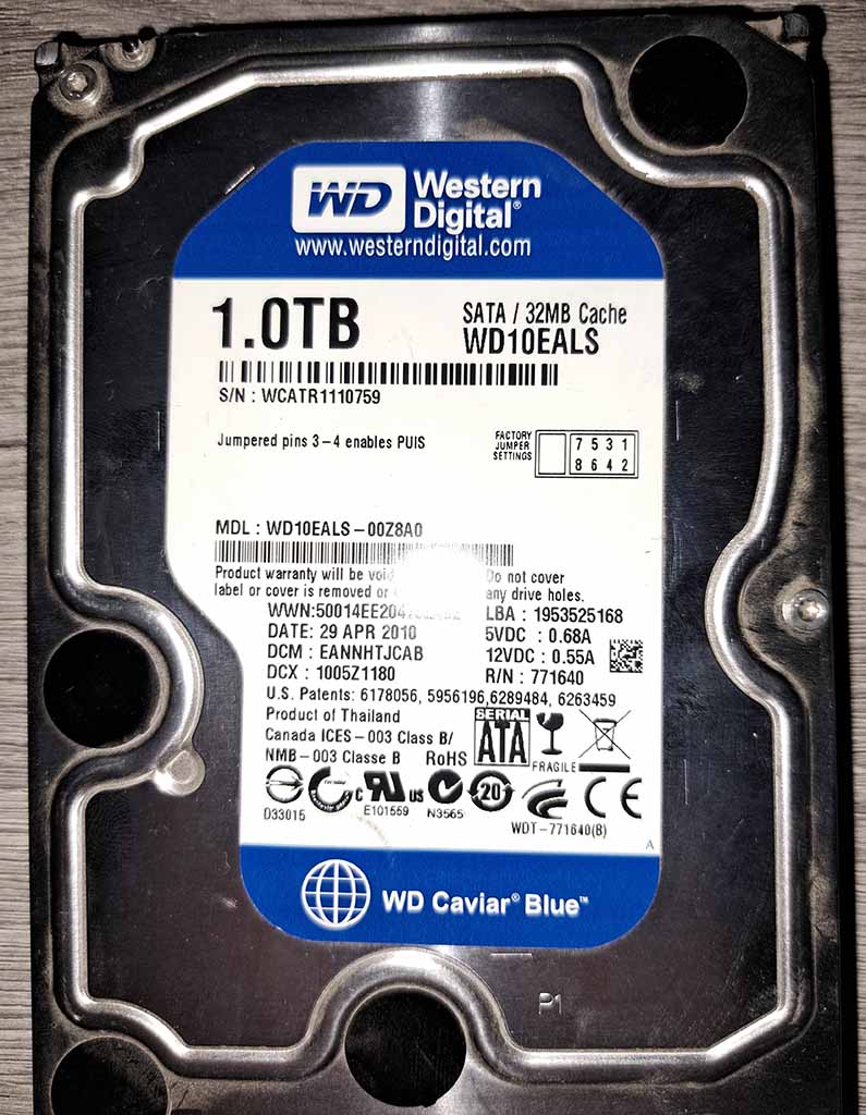 Винт на 1 Тб от WD причем Caviar Blue то есть с оборотами 7200. Модель WD10EALS, кэш 32 Мб. Интерфейс SATA II. Проверен, битых кластеров нет.