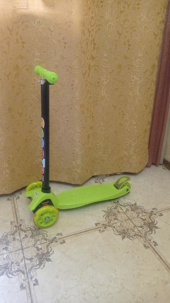 Алюминиевый руль самоката комплектуется резиновыми накладками, которые не дают рукам ребенка соскальзывать. Также, у него есть возможность регулироваться по высоте. Кроме этого, данная модель самоката получила функцию наклонного поворота руля. За счет трехколесной конструкции и сдвоенному заднему колесу, самокат достаточно безопасен и устойчив. Колеса самоката выполнены из полиуретана, что делает катание бесшумным. Качественные подшипники типа ABEC-7 способствуют быстрой и комфортной езде. Во время катания каждое колесо светится красным, синим и зеленым цветом. Пластмассовая дека самоката выполнена из прочного материала и крепится к раме. Самокат выдерживает нагрузку до 45кг. Для большей безопасности, самокат оборудован ножным наступающим тормозом (step-on brake), который размещен над задними колесами.
