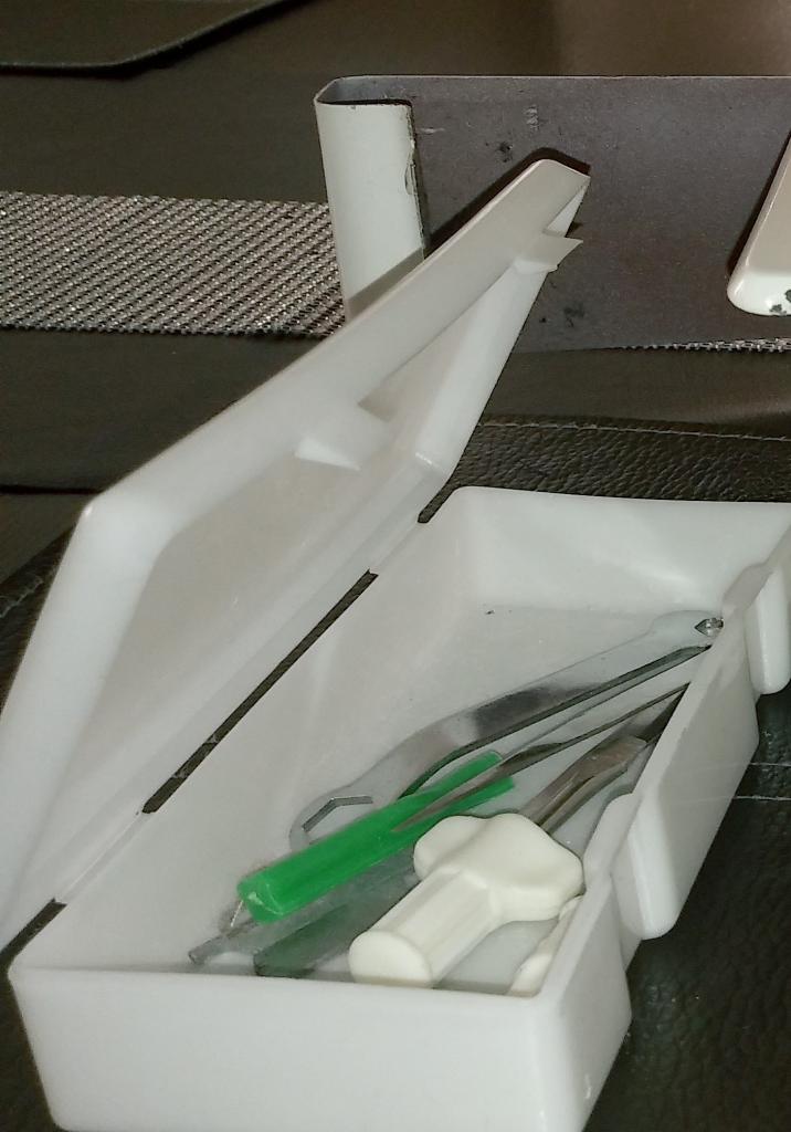 В комплекте идет коробочка с инструментами: пинцет, отвертки, ключ; 2 запасных ножа; педаль.