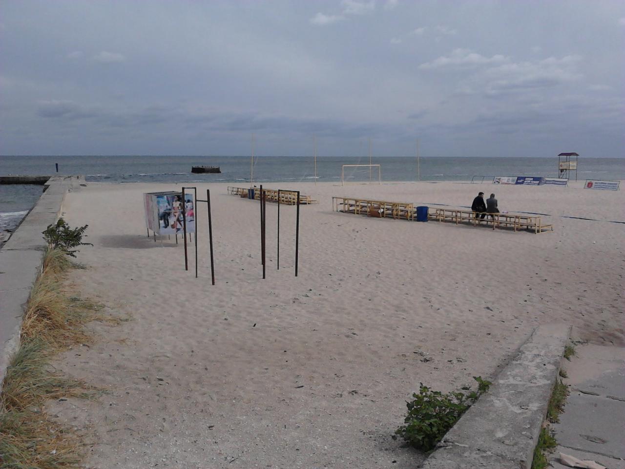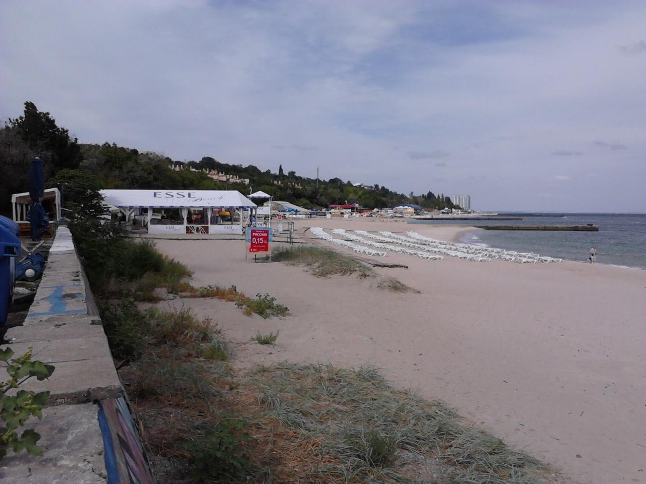 Аркадия, 11 часов. Вода тёплая и чистая, но дует холодный ветер. На песчаном пляже море куда-то "отъехало", на галечном всё, как было - узкая полоска.