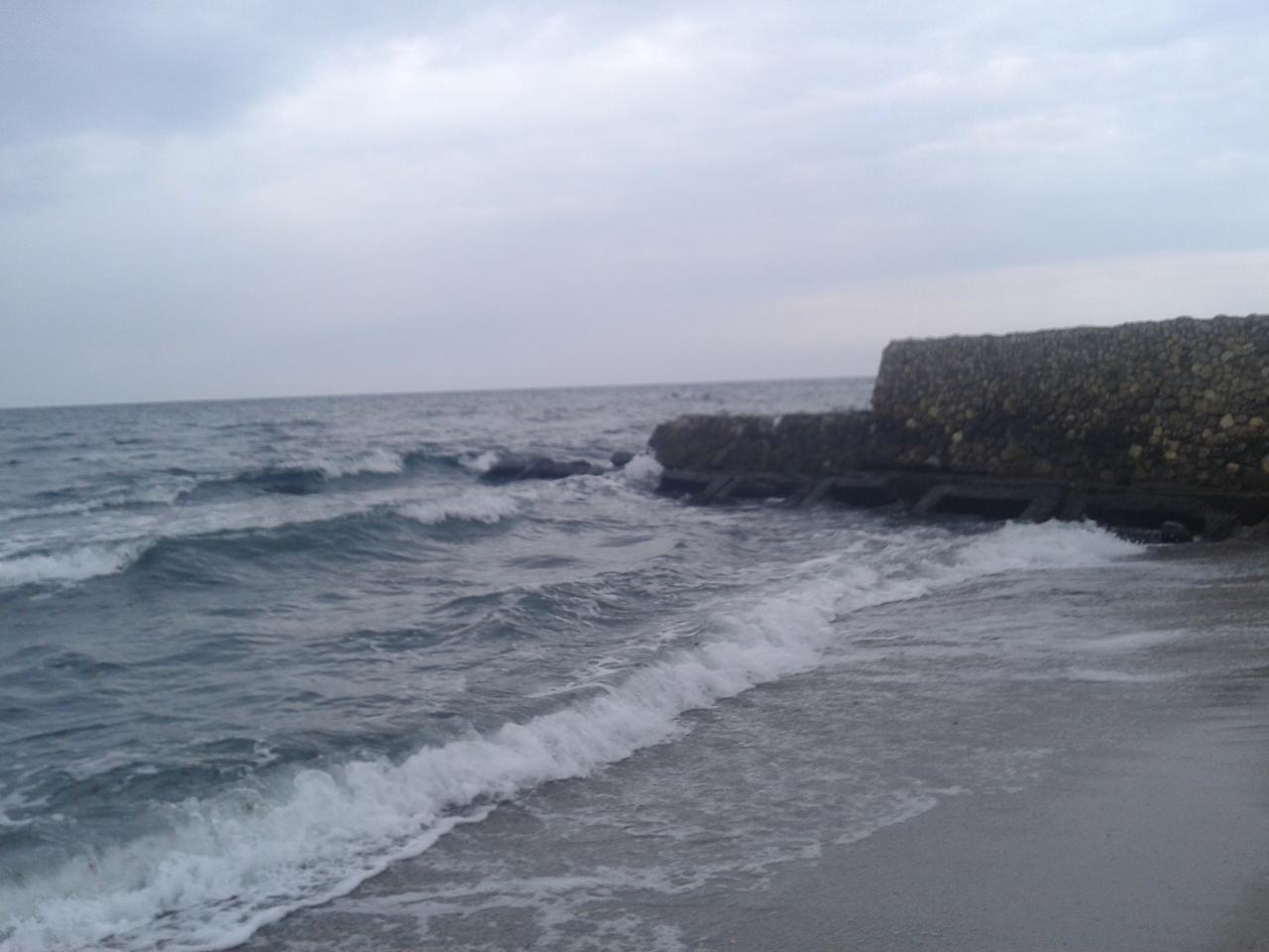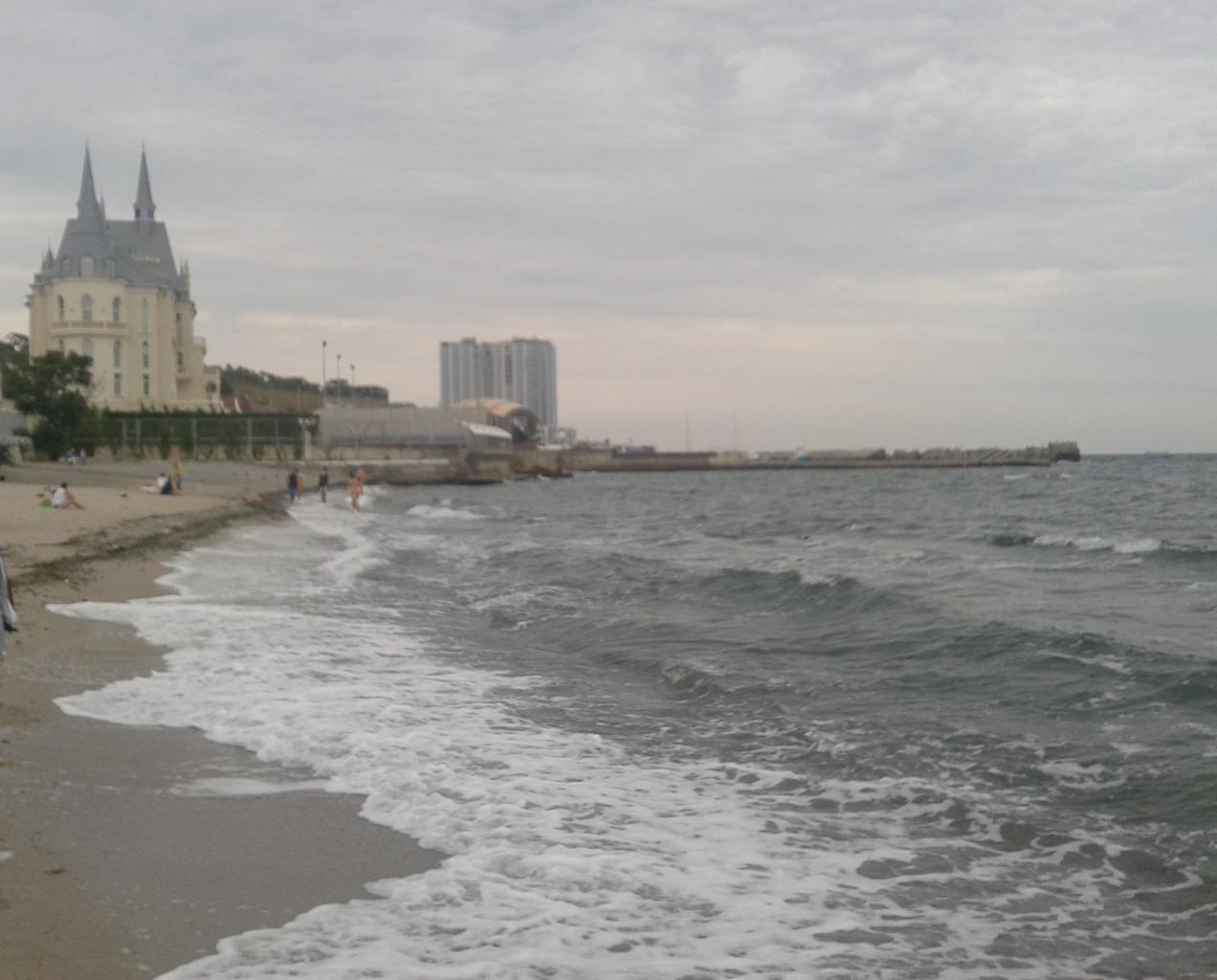 Пасмурно, штиль, на море небольшие волны, вода мутная. Воздух 23, вода 21. Да, и с неба что-то капает. Осень, наверно.