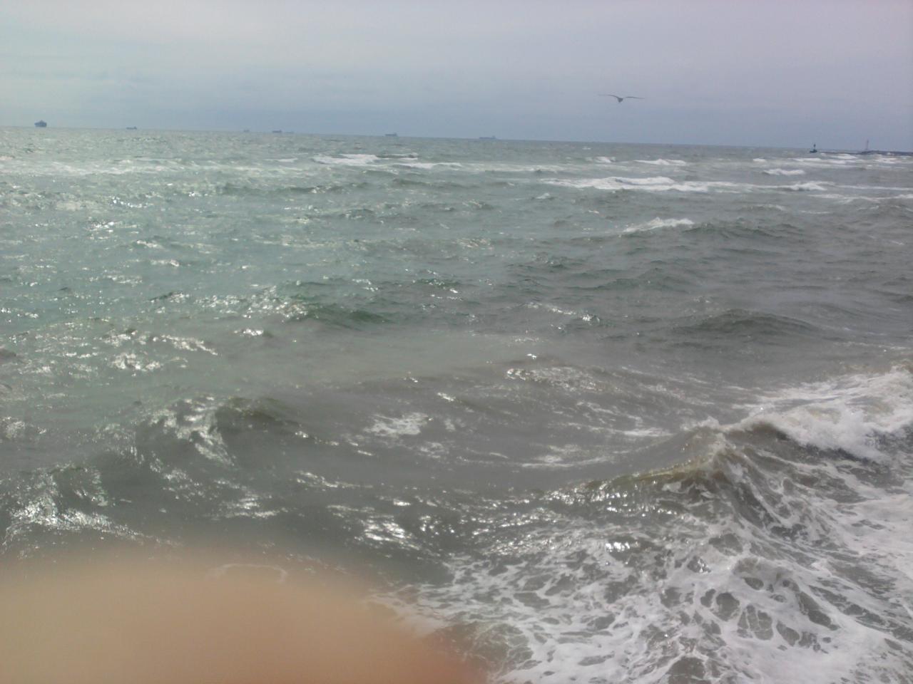 Только с моря...так,с чего начать)? ветер сумасшедший,волосы летали в разные стороны БЕСКОНЕЧНО,и холодный...бррр....вода баламутная грязная,как стоки откуда-то,но по голеностоп заходила-тёплая...волны большие,классные,детки и др плещатся,визжат,наблюдать прикольно))...если лежать на песке ближе к воде,то вполне возможно,что через 20 минут вы уже будете на МОКРОМ песке...от волн также бриз образуется) солнышка было почти не видно...то облачка,то тучки,потом затянулось..