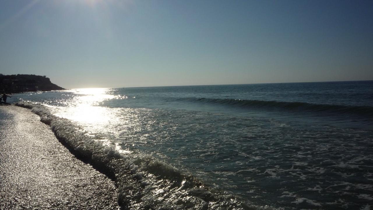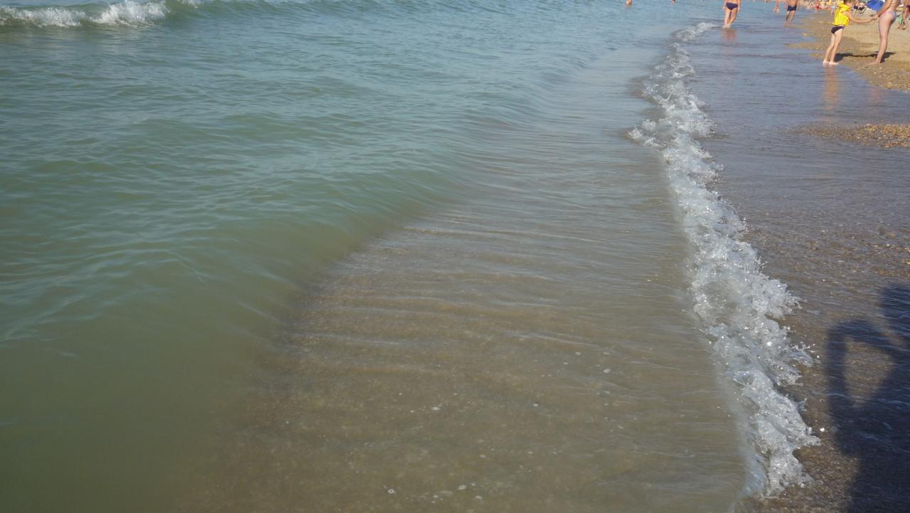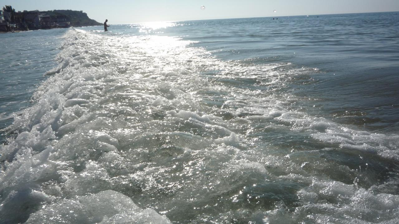зерновой утром, маленькие волны, мутная вода дальше от берега, в воде какие-то нити плавают. может какой-то выброс в море? показалось что вода слоями - холодная и теплая, причем бывало что теплая ближе к дну, а холодная сверху. у самого дна в 10 см прохладный термоклин. видел ската.