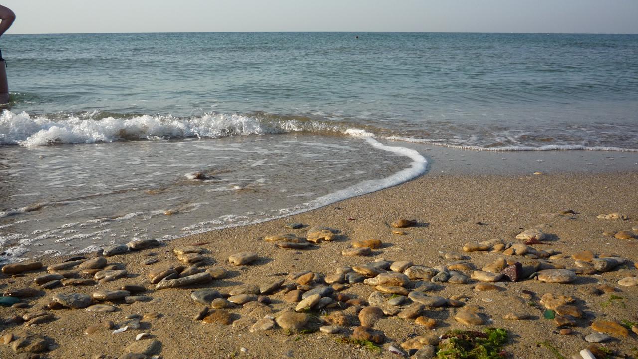 Море почти спокойное, мелкие волны, вода довольно прозрачная и соленая.