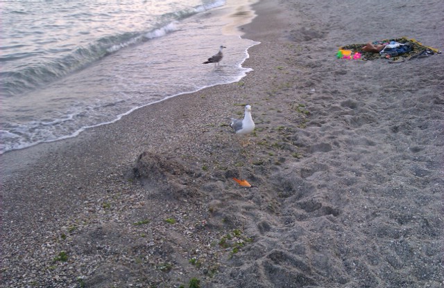 Вода 23 С, чистая и прозрачная. Возле волнореза неожиданно много маленьких медуз. Еще много "ручных" чаек) ходят между подстилками, выпрашивают еду)