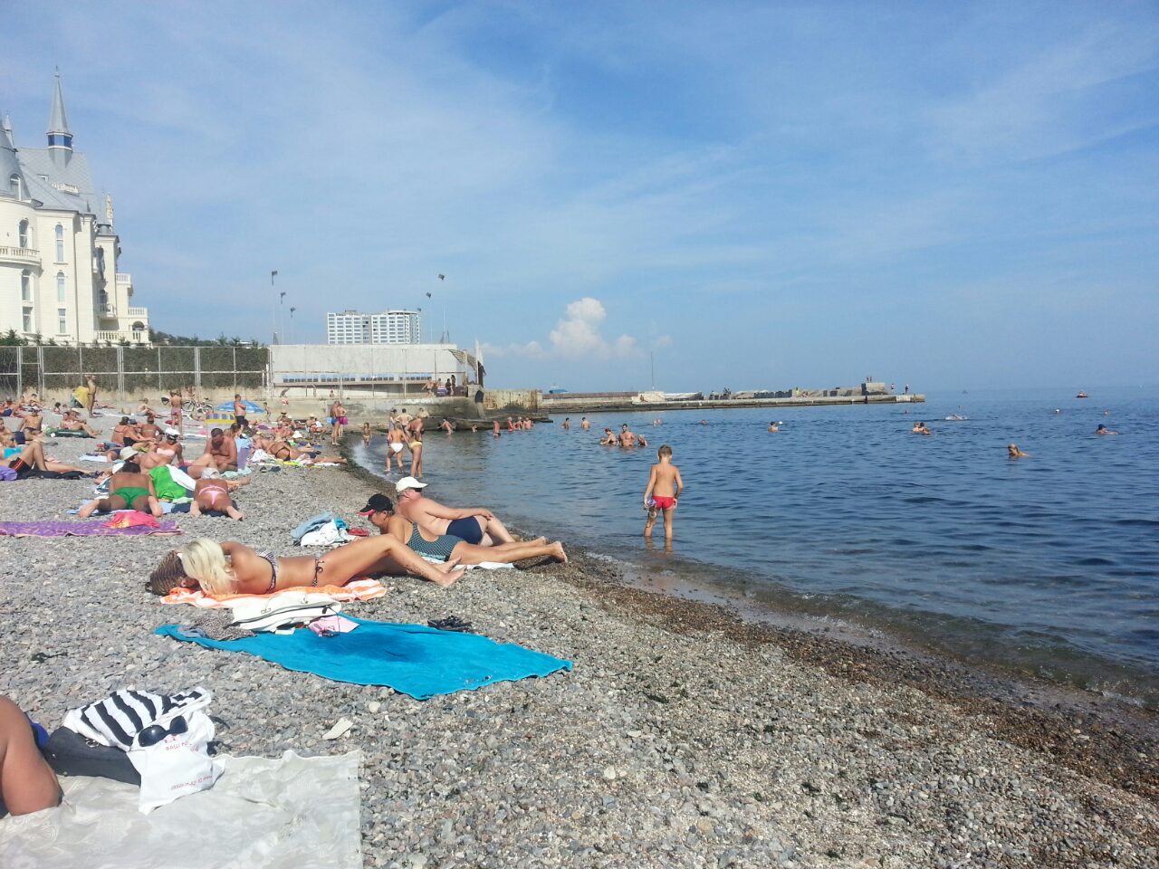 Пляж напротив Ривьеры. Вода чистая и прозрачная,21-22, не меньше. Воздух 28. Отличная погодка, шикарный запах моря. Корнеротов нет у берега,на глубину не заплывала.