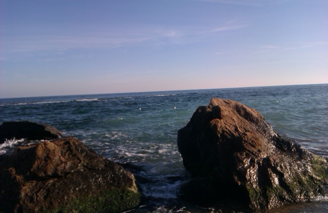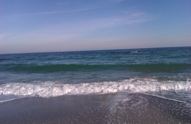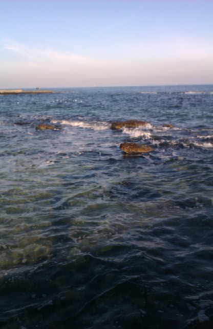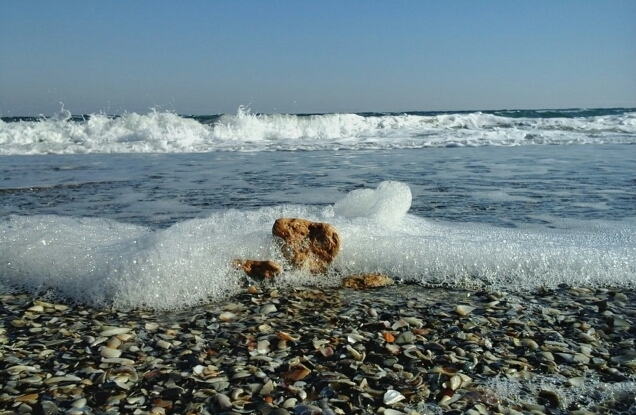 Море спокойное, только приливная волна чуть больше обычной, вода полупрозрачная и соленая.