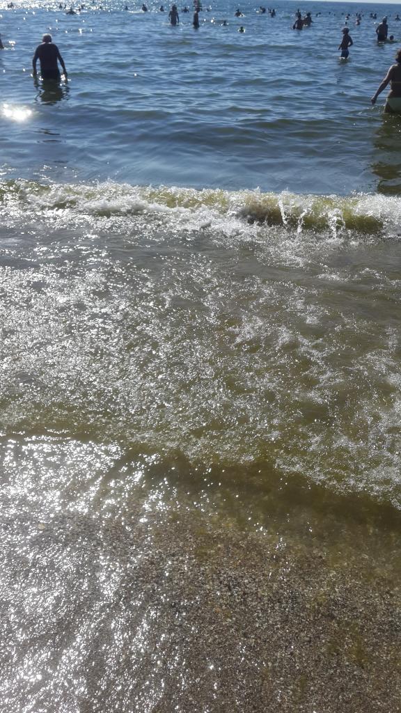 Кабельный, 9.30. Вода градусов 22, небольшая волна и приятный ветерок. Возле берега много водорослей, дальше вода относительно прозрачная. Людей много.