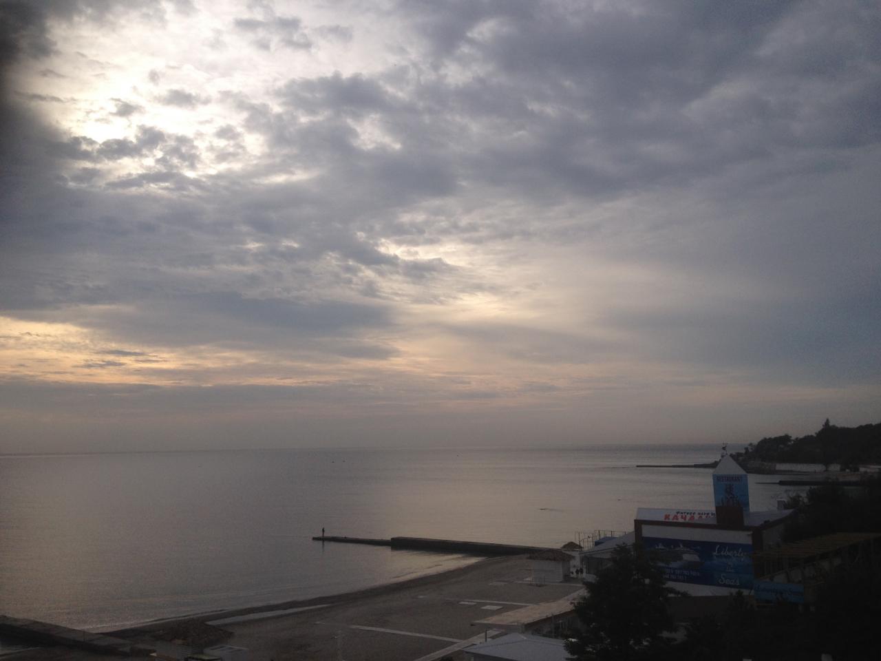 Отрада «Желтый камень», воздух +12С°, вода +16С°, чистая и прозрачная как в бассейне видно метров 5 и глубже, за волнорезом вода теплее вода +18С°, в воде комфортней чем на воздухе, солнце пыталось пробиться сквозь облака, ноне получилось принять солнечные ванны ))