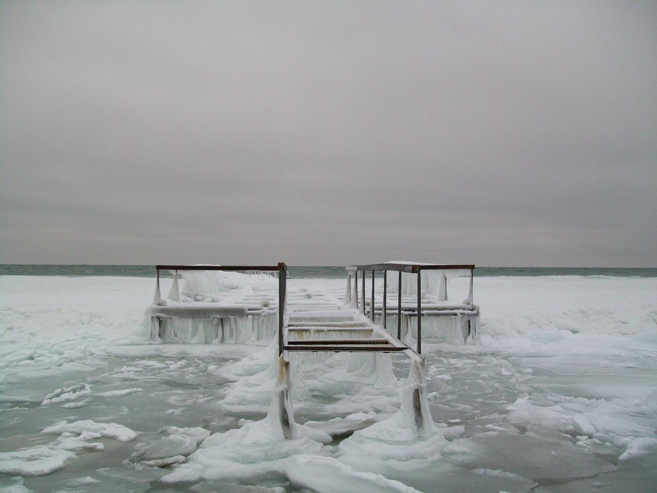 Пирс замерз. А собаке нашей, видимо, мороз не страшен. Бегала в море купаться, а потом отгрызала сосульки с груди и выплевывала. Да что с нее возьмешь - лайка. (Ой, а может она ноги грела?Вода, все-таки -1, а на улице все -20 было)