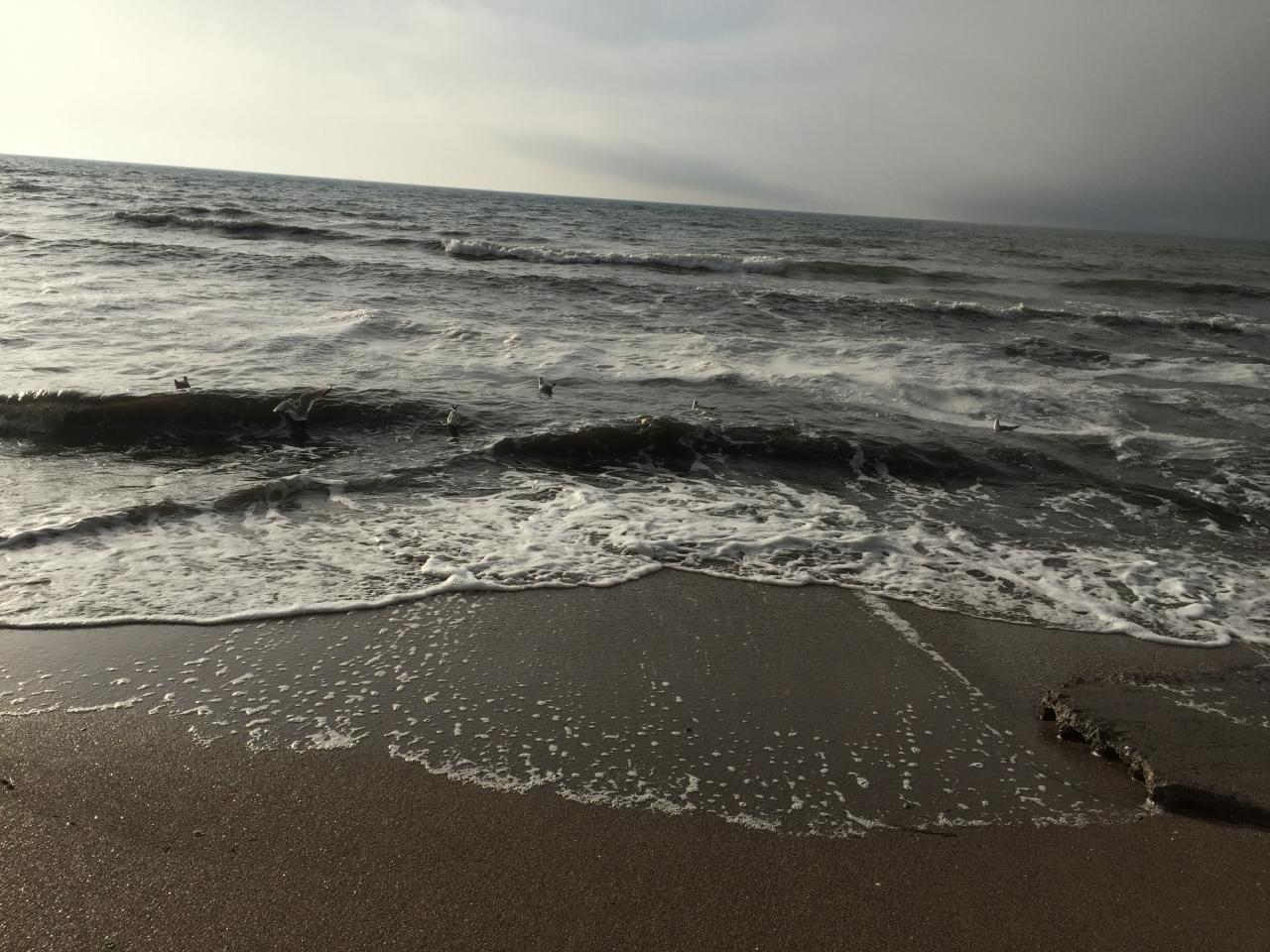 Небольшие волны, вода полупрозрачная и солёная.