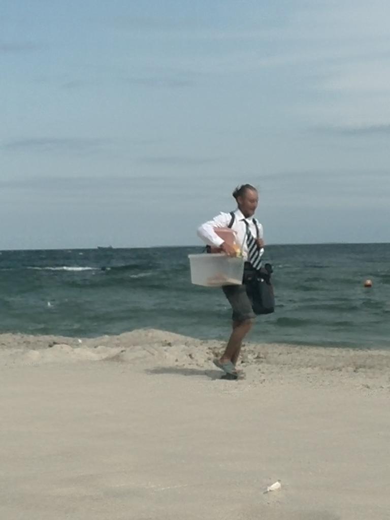 Мальчик в белой рубашке и галстуке креветки и пиво продавал)