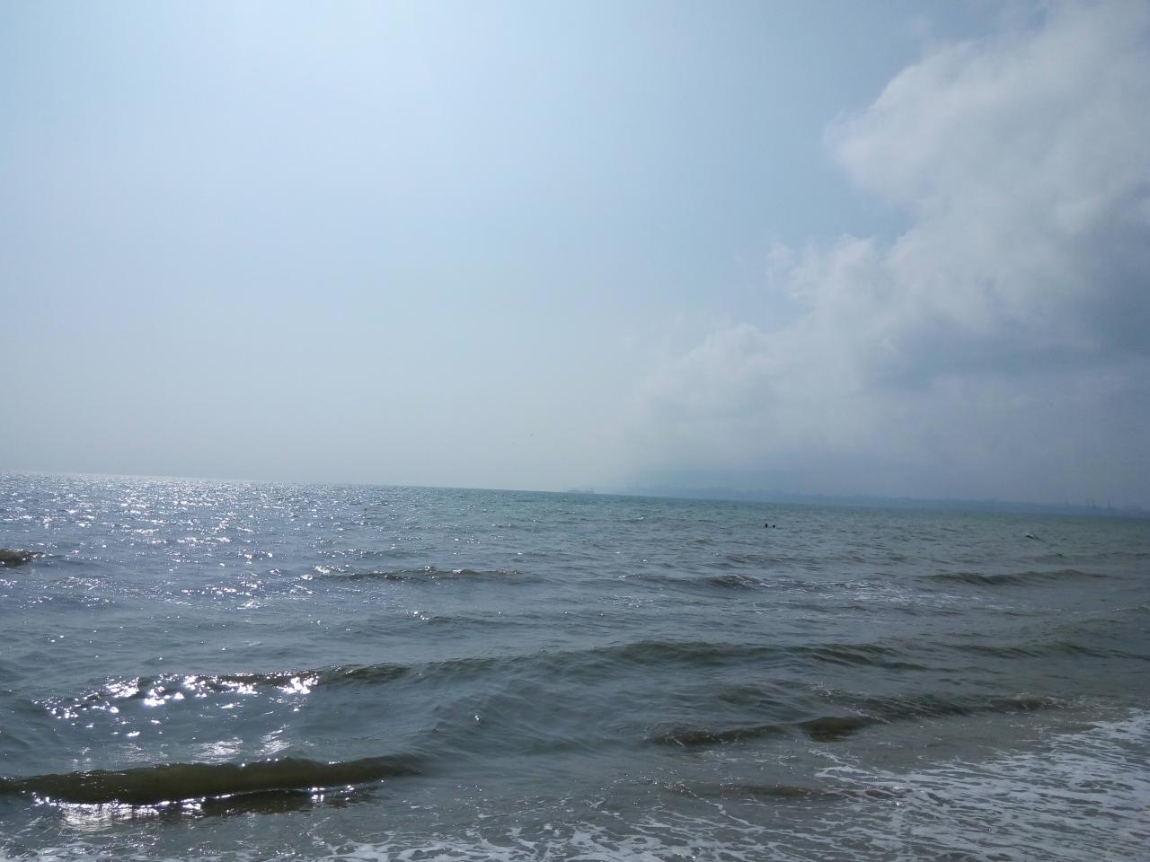 На море вода необычного серо-голубого цвета, 20 -21 градус, ветра нет, сильнейшая влажность, волны "таки , як треба".