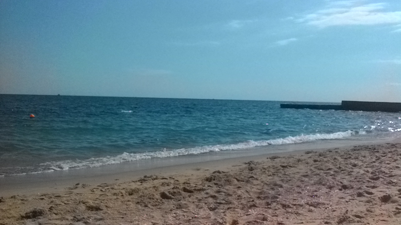 На море очень мелкие волны, вода прозрачная и солёная.