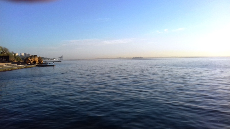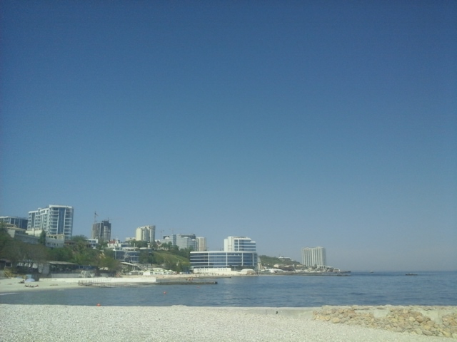 Чкаловский. Солнышко припекает, тихо, вода прозрачная, градусов 16 есть. По дну бегают крабики и шныряют бычки. На пирсе рыбачки. Народ загорает и купается не спеша.