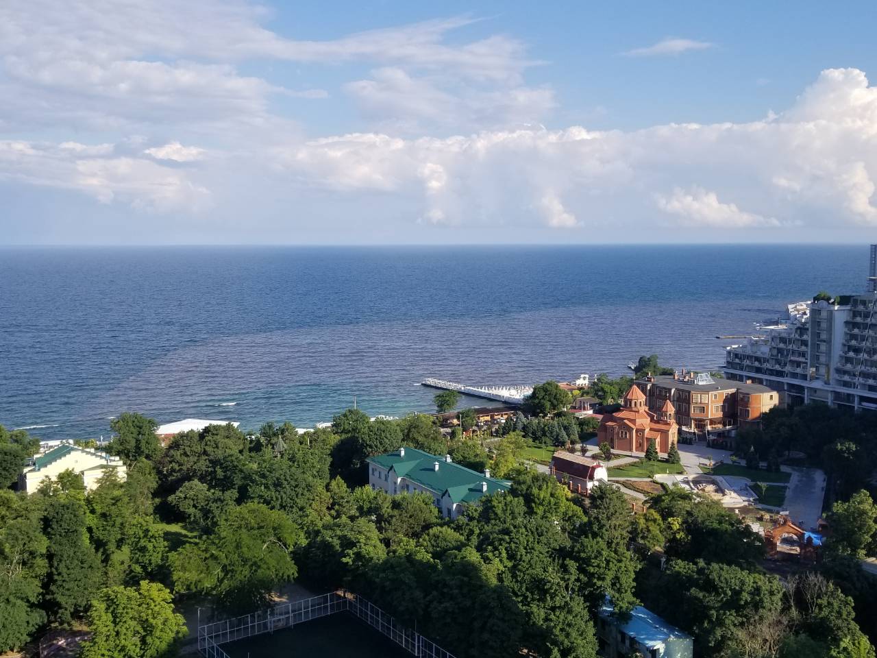 Возле причала 1 в данный момент вода немного с водорослями,20-21 градус, людей больше чем в воскресенье (что огорчило). Лёгкие волны, ветерок.
