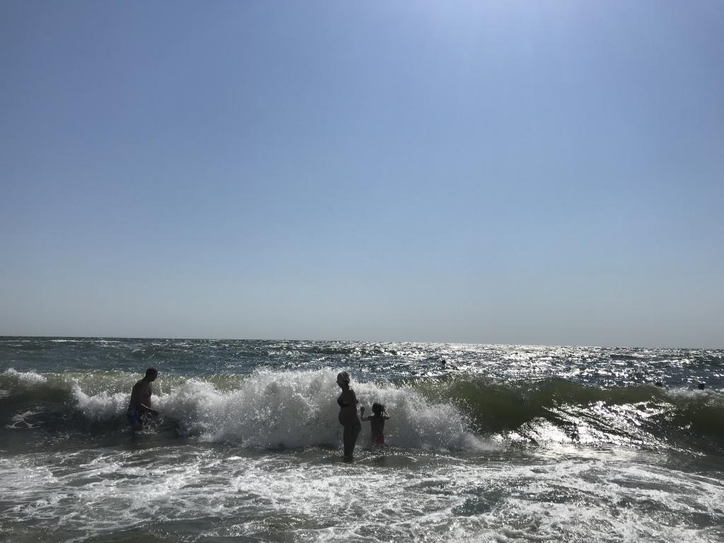 нас с дочкой, сегодня волна сбила с ног, когда мы стояли по пояс в воде.