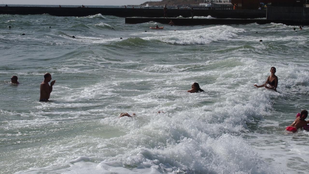 Волны понемногу утихают. Прозрачность воды нулевая по прежнему, пальцы вытянутой руки в воде не просматриваются,