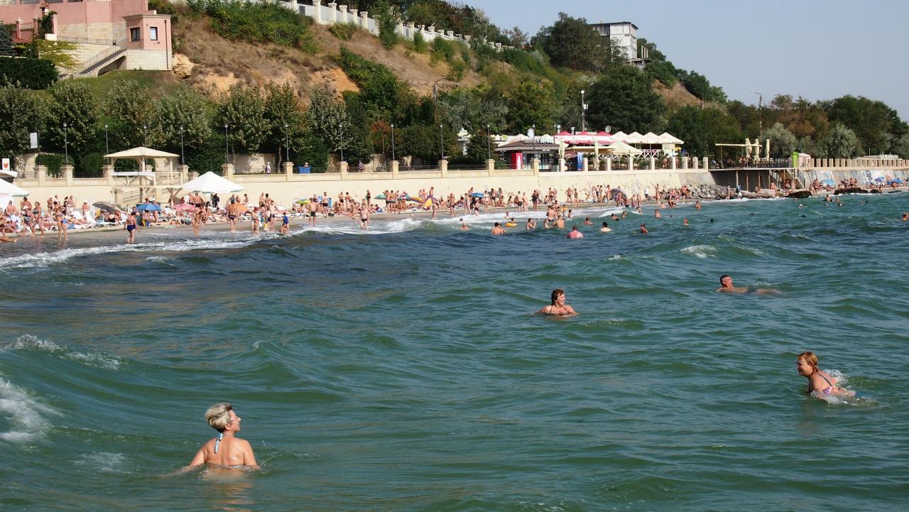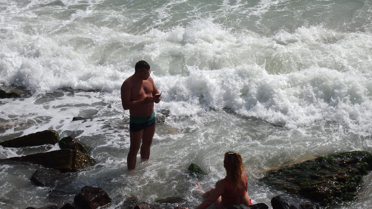 На море небольшие волны, вода полупрозрачная и солёная. У берега много водорослей.